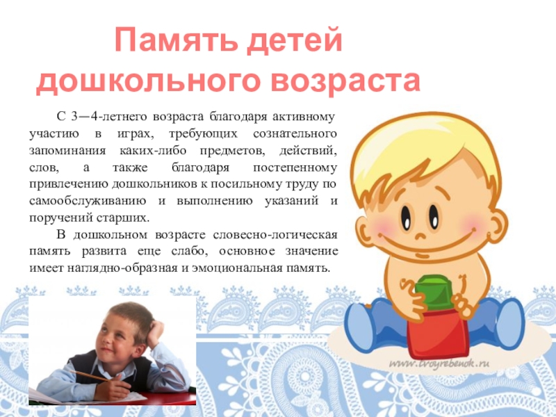 В дошкольном возрасте словесно-логическая память развита еще слабо, основное значение имеет наглядно-образная и эмоциональная память.