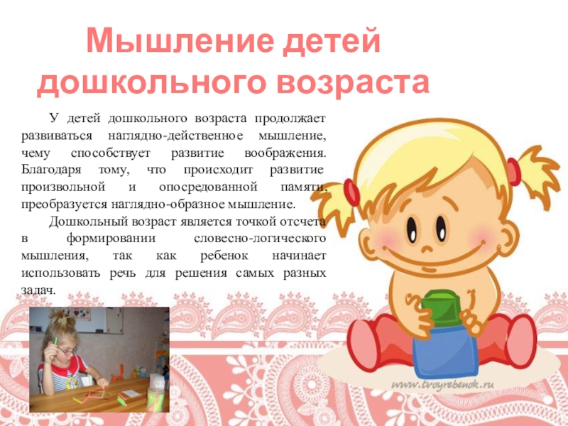 Дошкольный возраст является точкой отсчета в формировании словесно-логического мышления, так как ребенок начинает использовать речь для решения самых разных задач.