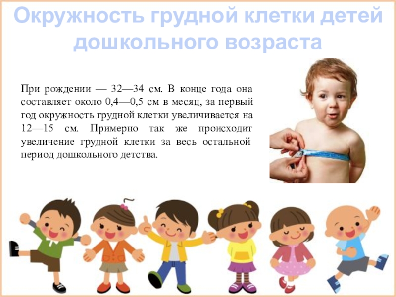 В конце года она составляет около 0,4—0,5 см в месяц, за первый год окружность грудной клетки увеличивается на 12—15 см. Примерно так же происходит увеличение грудной клетки за весь остальной период дошкольного детства.