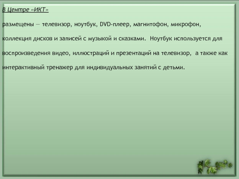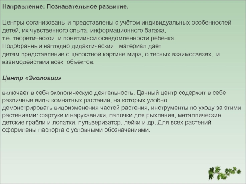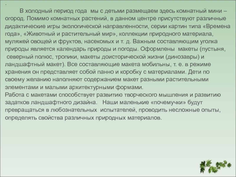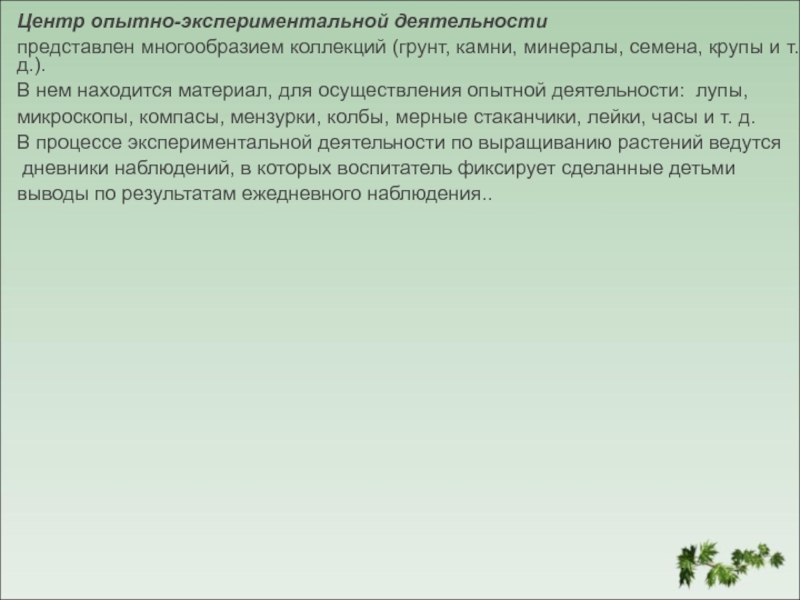 включает в себя экологическую деятельность. Данный центр содержит в себе различные виды комнатных растений, на которых удобно
