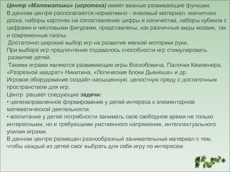 Слайд 10Центр «Математики» (игротека) имеет важные развивающие функции.