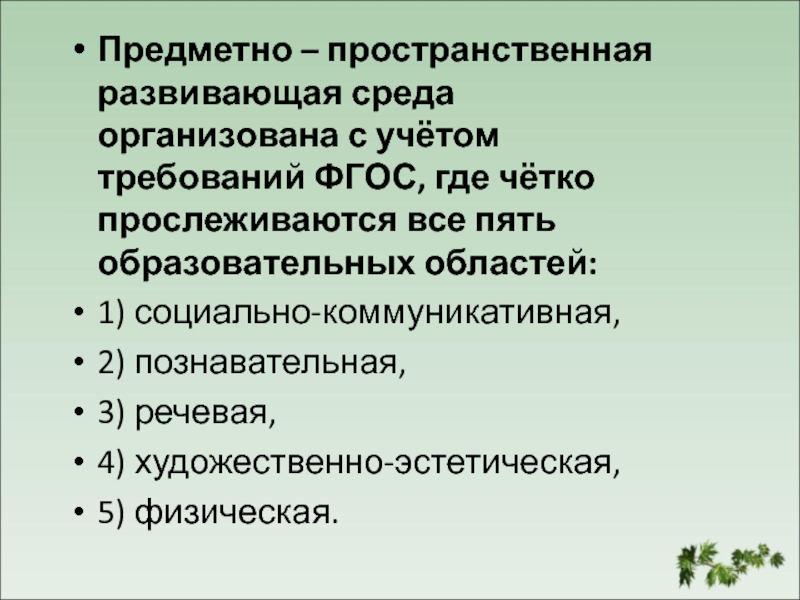 Предметно – пространственная развивающая среда организована с учётом требований ФГОС, где