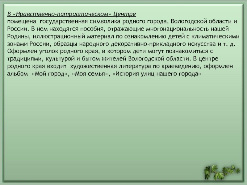 В нем находятся пособия, отражающие многонациональность нашей Родины, иллюстрационный материал по ознакомлению детей с климатическими зонами России, образцы народного декоративно-прикладного искусства и т. д. Оформлен уголок родного края, в котором дети могут познакомиться с традициями, культурой и бытом жителей Вологодской области. В центре родного края входит художественная литература по краеведению, оформлен альбом «Мой город», «Моя семья», «История улиц нашего города»