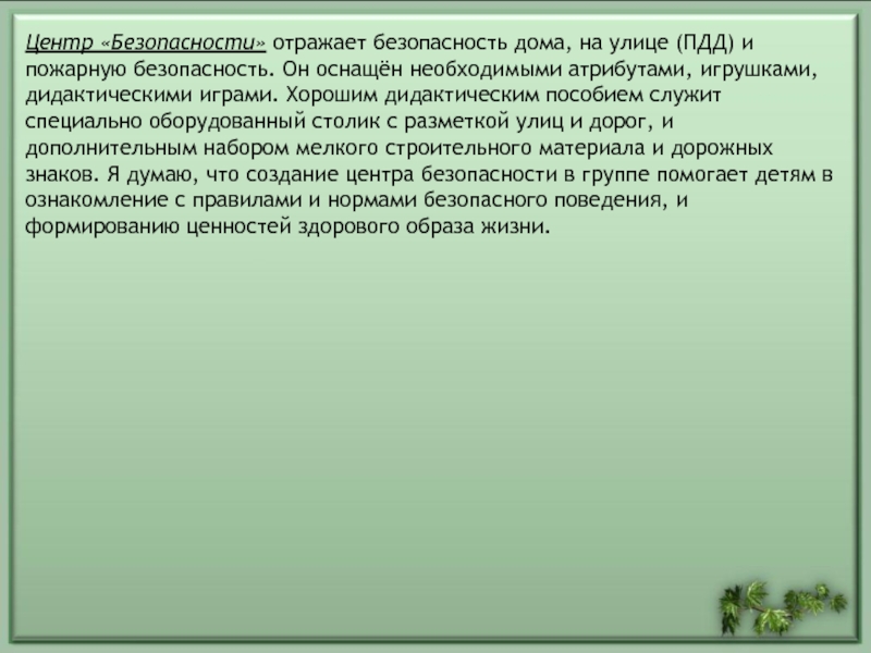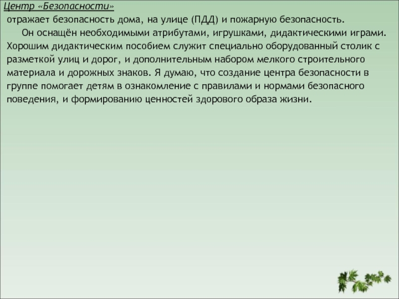 Слайд 25Центр «Безопасности» отражает безопасность дома, на улице (ПДД) и пожарную безопасность. Он