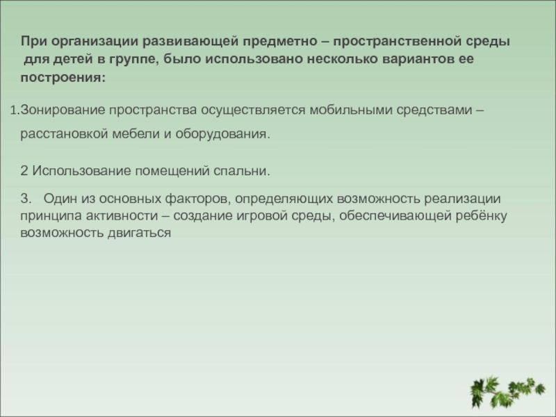3. Один из основных факторов, определяющих возможность реализации принципа активности – создание игровой среды, обеспечивающей ребёнку возможность двигаться