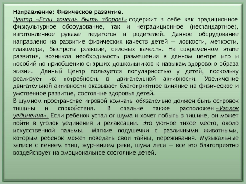 физкультурное оборудование, так и нетрадиционное (нестандартное), изготовленное руками педагогов и родителей. Данное оборудование направлено на развитие физических качеств детей — ловкости, меткости, глазомера, быстроты реакции, силовых качеств. На современном этапе развития, возникла необходимость размещения в данном центре игр и пособий по приобщению старших дошкольников к навыкам здорового образа жизни. Данный Центр пользуется популярностью у детей, поскольку реализует их потребность в двигательной активности. Увеличение двигательной активности оказывает благоприятное влияние на физическое и умственное развитие, состояние здоровья детей.