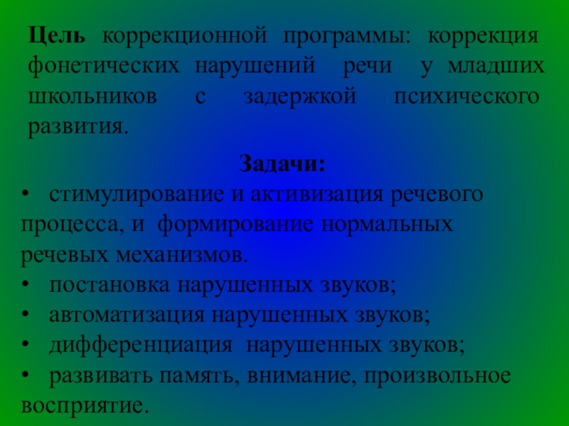 • стимулирование и активизация речевого процесса, и формирование нормальных речевых механизмов.