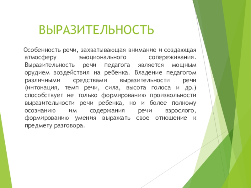 сопереживания. Выразительность речи педагога является мощным орудием воздействия на ребенка. Владение педагогом различными средствами выразительности речи (интонация, темп речи, сила, высота голоса и др.) способствует не только формированию произвольности выразительности речи ребенка, но и более полному осознанию им содержания речи взрослого, формированию умения выражать свое отношение к предмету разговора.