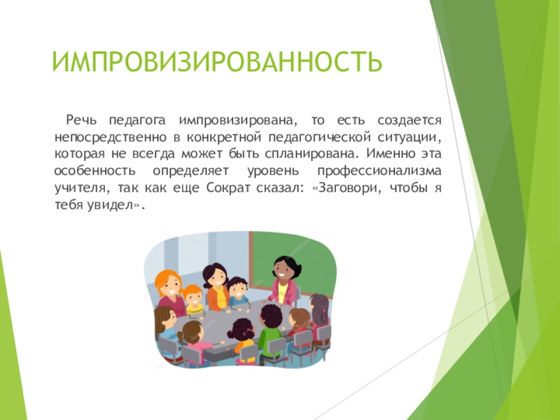 конкретной педагогической ситуации, которая не всегда может быть спланирована. Именно эта особенность определяет уровень профессионализма учителя, так как еще Сократ сказал: «Заговори, чтобы я тебя увидел».