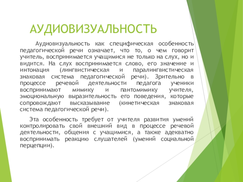 Аудиовизуальность как специфическая особенность педагогической речи означает, что