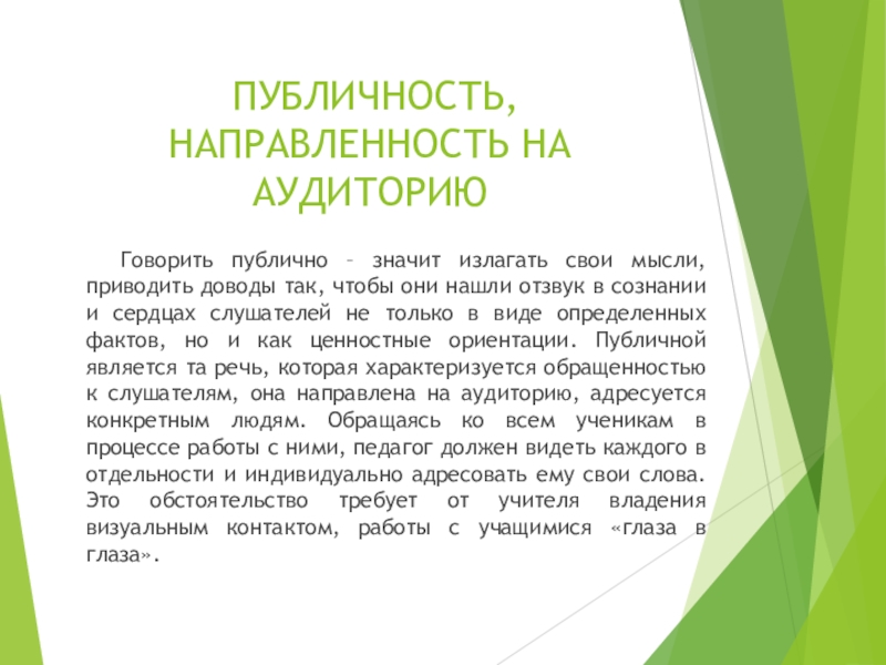 свои мысли, приводить доводы так, чтобы они нашли отзвук в сознании и сердцах слушателей не только в виде определенных фактов, но и как ценностные ориентации. Публичной является та речь, которая характеризуется обращенностью к слушателям, она направлена на аудиторию, адресуется конкретным людям. Обращаясь ко всем ученикам в процессе работы с ними, педагог должен видеть каждого в отдельности и индивидуально адресовать ему свои слова. Это обстоятельство требует от учителя владения визуальным контактом, работы с учащимися «глаза в глаза».