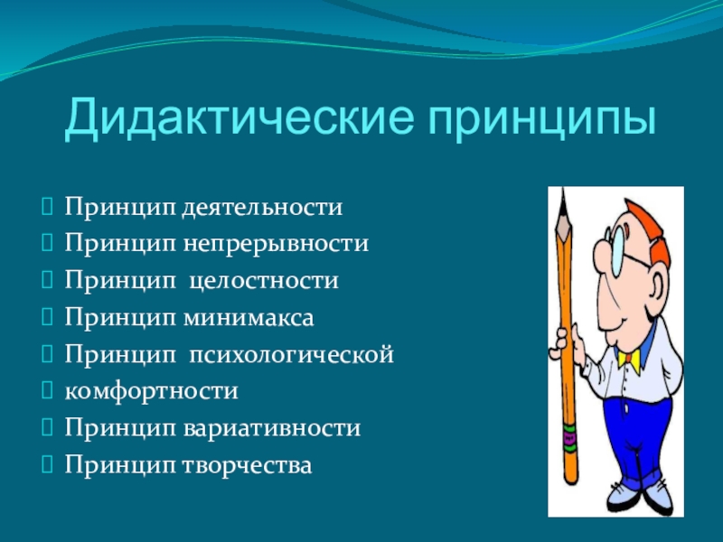 Дидактические принципыПринцип деятельностиПринцип непрерывностиПринцип целостностиПринцип минимаксаПринцип психологической комфортностиПринцип вариативностиПринцип творчества