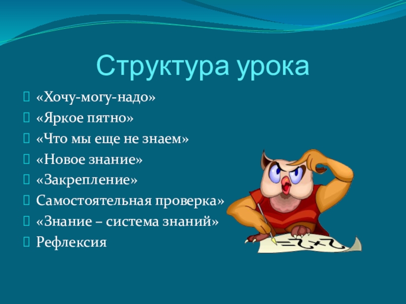Структура урока«Хочу-могу-надо»«Яркое пятно»«Что мы еще не знаем»«Новое знание»«Закрепление»Самостоятельная проверка»«Знание – система знаний»Рефлексия