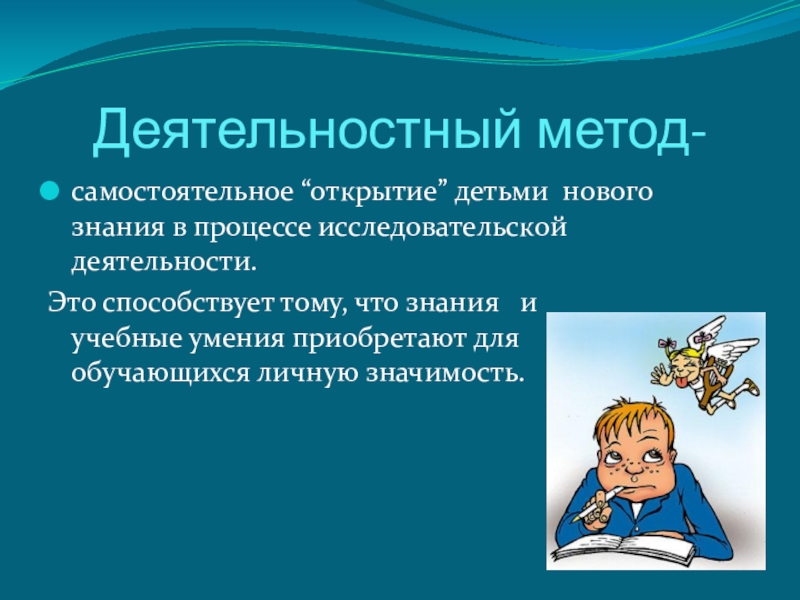 Деятельностный метод-самостоятельное “открытие” детьми нового знания в процессе исследовательской деятельности. Это способствует тому, что знания   и