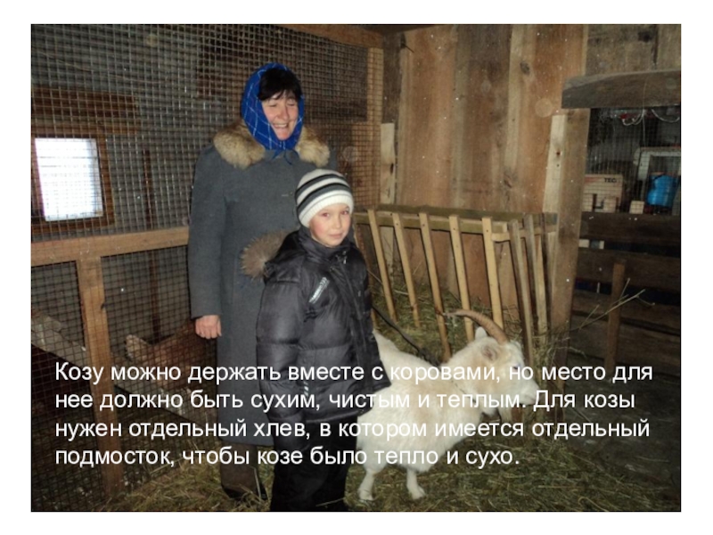 Козу можно держать вместе с коровами, но место для нее должно быть сухим, чистым и теплым. Для козы нужен отдельный хлев, в котором имеется отдельный подмосток, чтобы козе было тепло и сухо.
