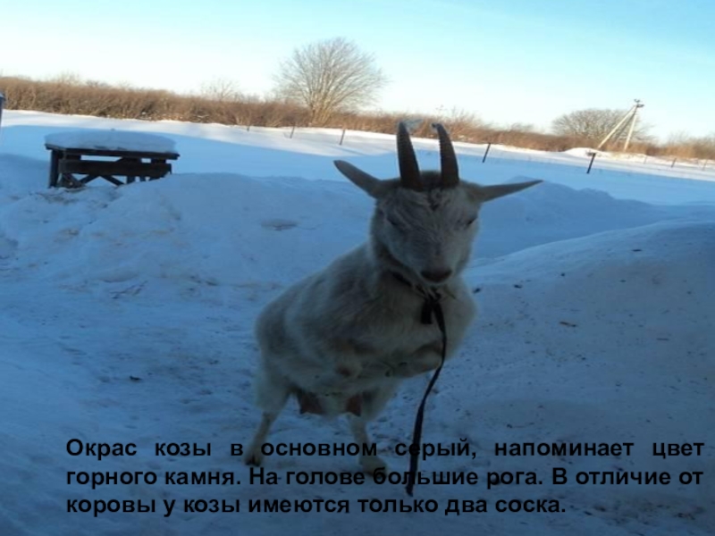 Окрас козы в основном серый, напоминает цвет горного камня. На голове большие рога. В отличие от коровы у козы имеются только два соска.