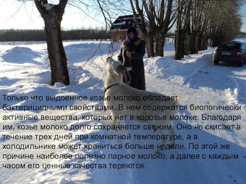 Только что выдоенное козье молоко обладает бактерицидными свойствами. В нем содержатся биологически активные вещества, которых нет в коровье молоке. Благодаря им, козье молоко долго сохраняется свежим. Оно не скисает в течение трех дней при комнатной температуре, а в холодильнике может храниться больше недели. По этой же причине наиболее полезно парное молоко, а далее с каждым часом его ценные качества теряются.