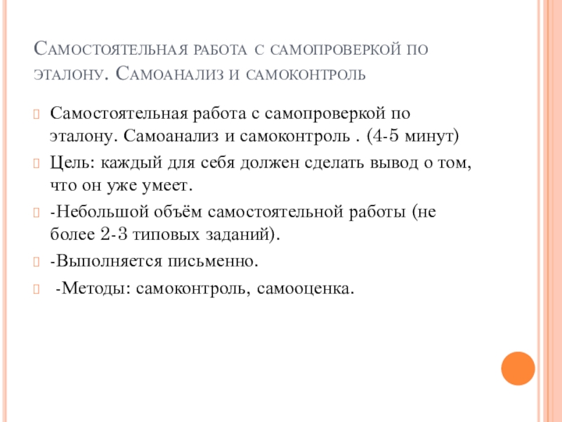 Слайд 11Самостоятельная работа с самопроверкой по эталону. Самоанализ и самоконтроль