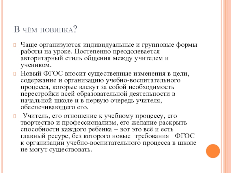 Учитель, его отношение к учебному процессу, его творчество и профессионализм, его желание раскрыть способности каждого ребенка – вот это всё и есть главный ресурс, без которого новые требования ФГОС к организации учебно-воспитательного процесса в школе не могут существовать.