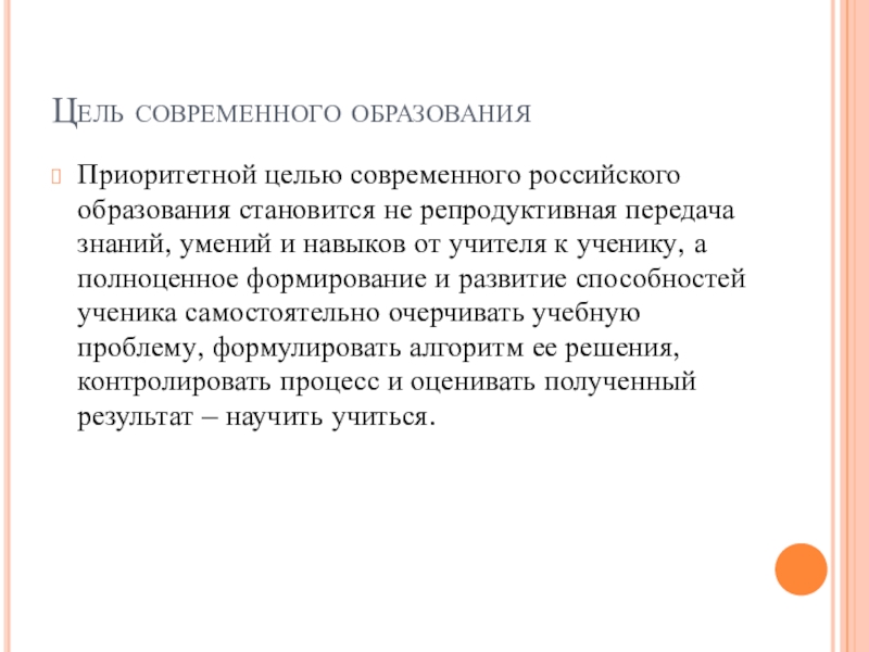 Приоритетной целью современного российского образования становится не репродуктивная передача