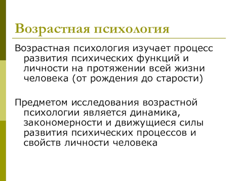 Предметом исследования возрастной психологии является динамика, закономерности и движущиеся силы развития психических процессов и свойств личности человека