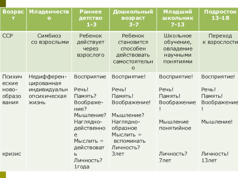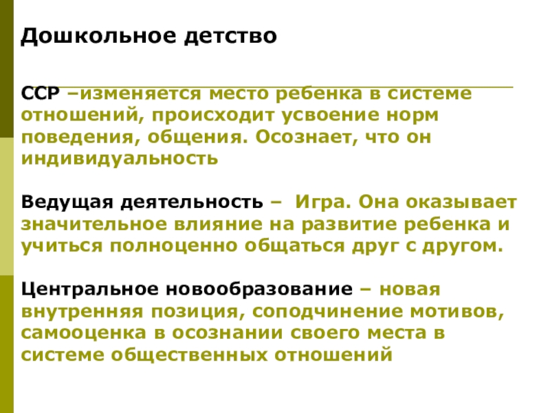 ССР –изменяется место ребенка в системе отношений, происходит усвоение норм