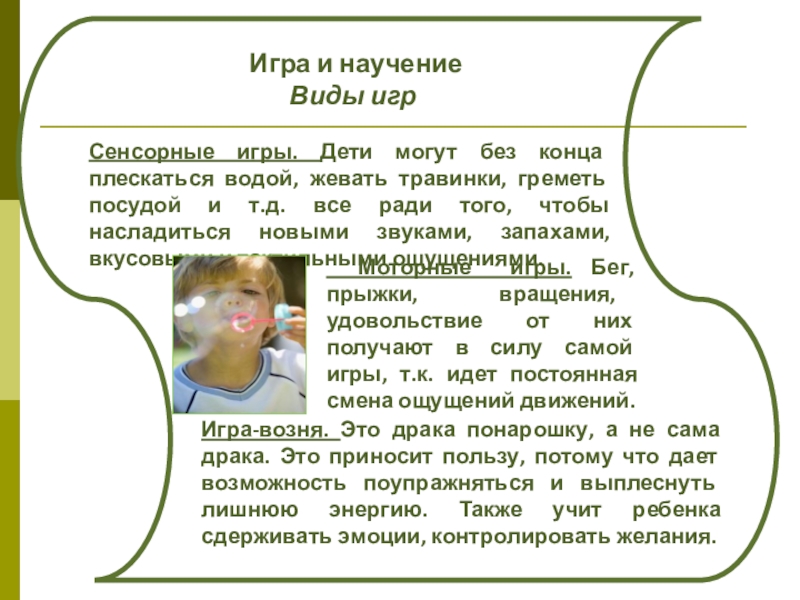 Игра-возня. Это драка понарошку, а не сама драка. Это приносит пользу, потому что дает возможность поупражняться и выплеснуть лишнюю энергию. Также учит ребенка сдерживать эмоции, контролировать желания.