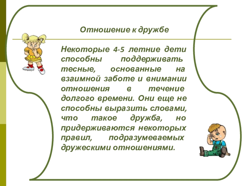 взаимной заботе и внимании отношения в течение долгого времени. Они еще не способны выразить словами, что такое дружба, но придерживаются некоторых правил, подразумеваемых дружескими отношениями.