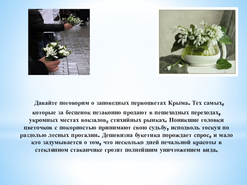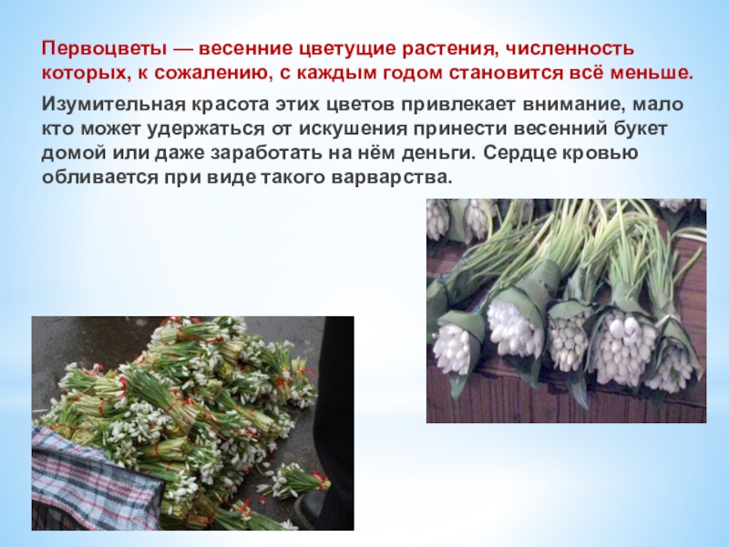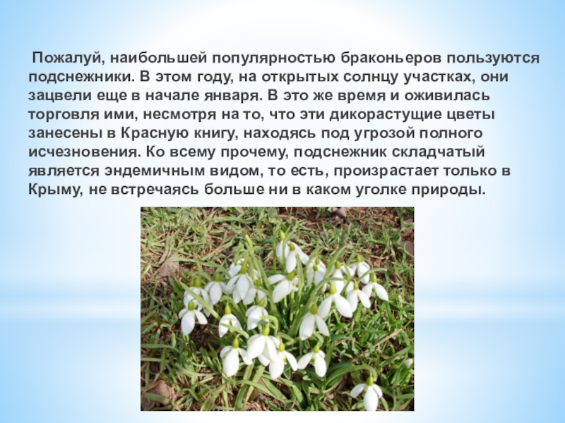 Слайд 9 Пожалуй, наибольшей популярностью браконьеров пользуются подснежники. В этом году, на