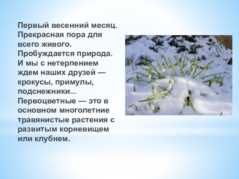 Слайд 4Первый весенний месяц. Прекрасная пора для всего живого. Пробуждается природа. И