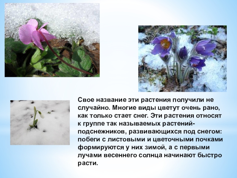 рано, как только стает снег. Эти растения относят к группе так называемых растений-подснежников, развивающихся под снегом: побеги с листовыми и цветочными почками формируются у них зимой, а с первыми лучами весеннего солнца начинают быстро расти.