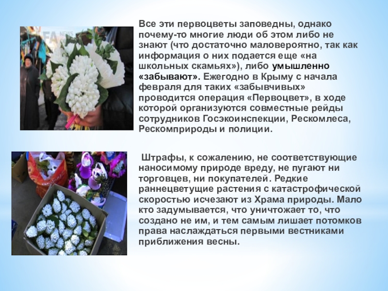 не знают (что достаточно маловероятно, так как информация о них подается еще «на школьных скамьях»), либо умышленно «забывают». Ежегодно в Крыму с начала февраля для таких «забывчивых» проводится операция «Первоцвет», в ходе которой организуются совместные рейды сотрудников Госэкоинспекции, Рескомлеса, Рескомприроды и полиции.