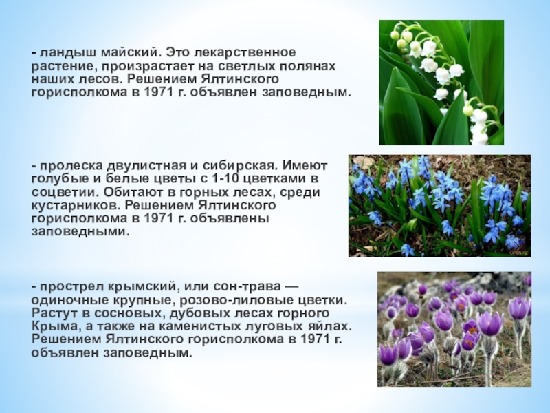 - пролеска двулистная и сибирская. Имеют голубые и белые цветы с 1-10 цветками в соцветии. Обитают в горных лесах, среди кустарников. Решением Ялтинского горисполкома в 1971 г. объявлены заповедными.