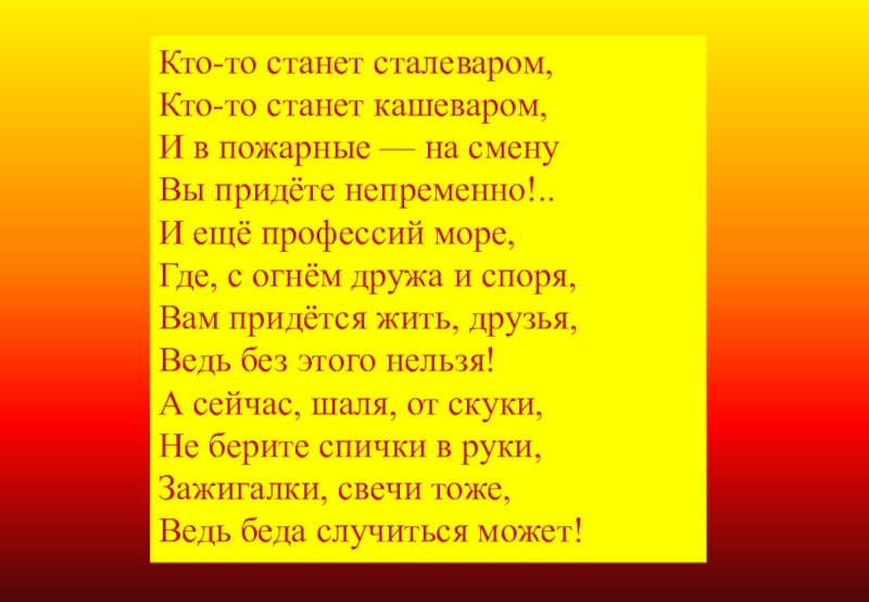Кто-то станет сталеваром, Кто-то станет кашеваром, И в пожарные — на смену Вы придёте непременно!..И ещё профессий
