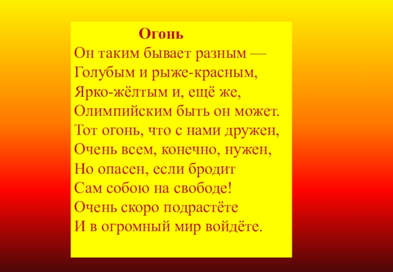 Тот огонь, что с нами дружен, Очень всем, конечно, нужен, Но опасен, если бродит Сам собою на свободе!