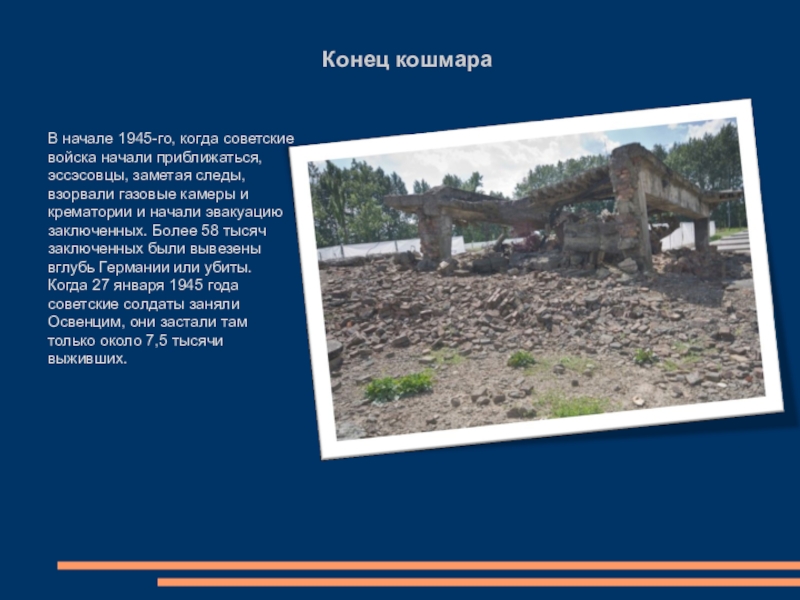 следы, взорвали газовые камеры и крематории и начали эвакуацию заключенных. Более 58 тысяч заключенных были вывезены вглубь Германии или убиты. Когда 27 января 1945 года советские солдаты заняли Освенцим, они застали там только около 7,5 тысячи выживших.