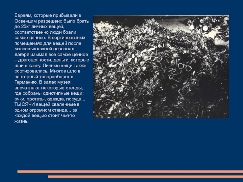 Слайд 9Евреям, которые прибывали в Освенцим разрешено было брать до 25кг личных