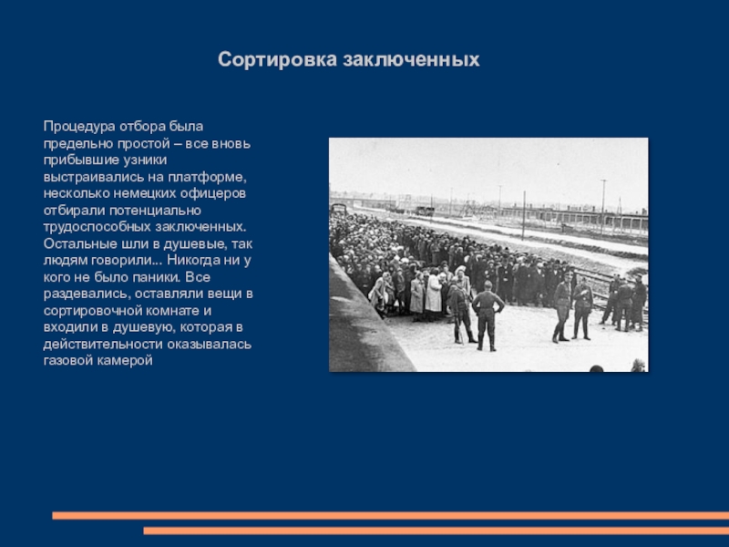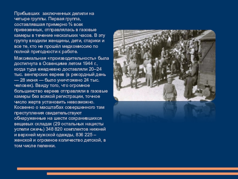 Слайд 8Прибывших заключенных делили на четыре группы. Первая группа, составлявшая примерно ¾