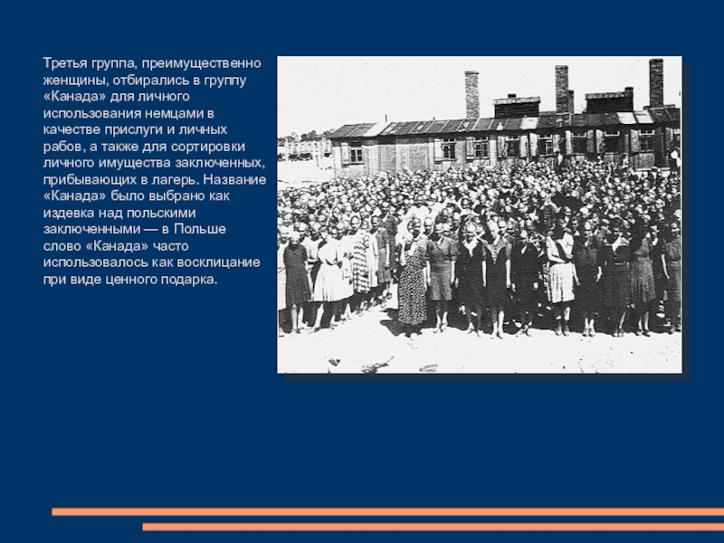 немцами в качестве прислуги и личных рабов, а также для сортировки личного имущества заключенных, прибывающих в лагерь. Название «Канада» было выбрано как издевка над польскими заключенными — в Польше слово «Канада» часто использовалось как восклицание при виде ценного подарка.