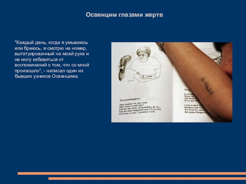 на номер, вытатуированный на моей руке и не могу избавиться от воспоминаний о том, что со мной произошло", - написал один из бывших узников Освенцима.