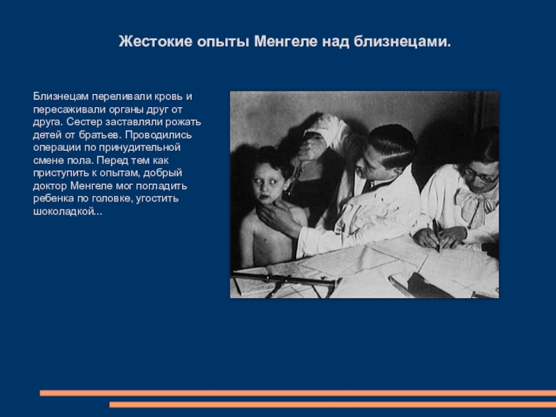 Слайд 15 Жестокие опыты Менгеле над близнецами.