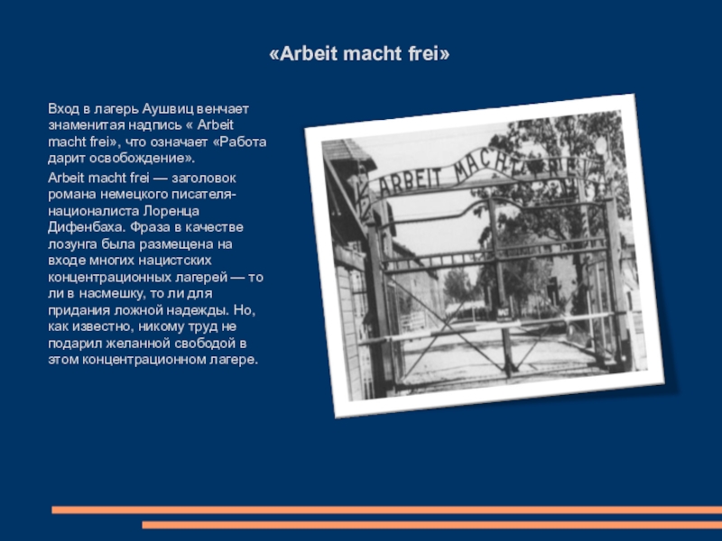 Arbeit macht frei — заголовок романа немецкого писателя-националиста Лоренца Дифенбаха. Фраза в качестве лозунга была размещена на входе многих нацистских концентрационных лагерей — то ли в насмешку, то ли для придания ложной надежды. Но, как известно, никому труд не подарил желанной свободой в этом концентрационном лагере.