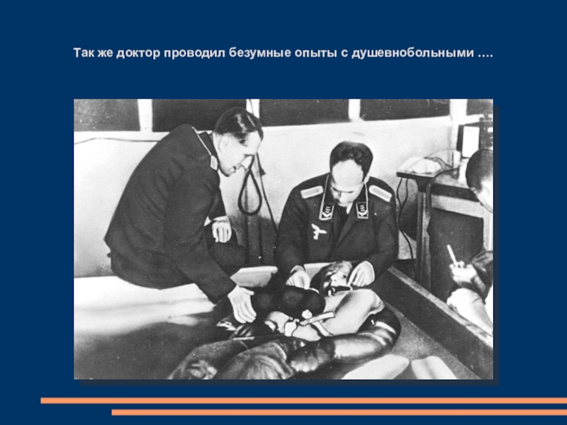 Слайд 16Так же доктор проводил безумные опыты с душевнобольными ….