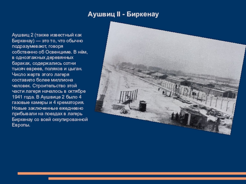 то, что обычно подразумевают, говоря собственно об Освенциме. В нём, в одноэтажных деревянных бараках, содержались сотни тысяч евреев, поляков и цыган. Число жертв этого лагеря составило более миллиона человек. Строительство этой части лагеря началось в октябре 1941 года. В Аушвице 2 было 4 газовые камеры и 4 крематория. Новые заключенные ежедневно прибывали на поездах в лагерь Биркенау со всей оккупированной Европы.