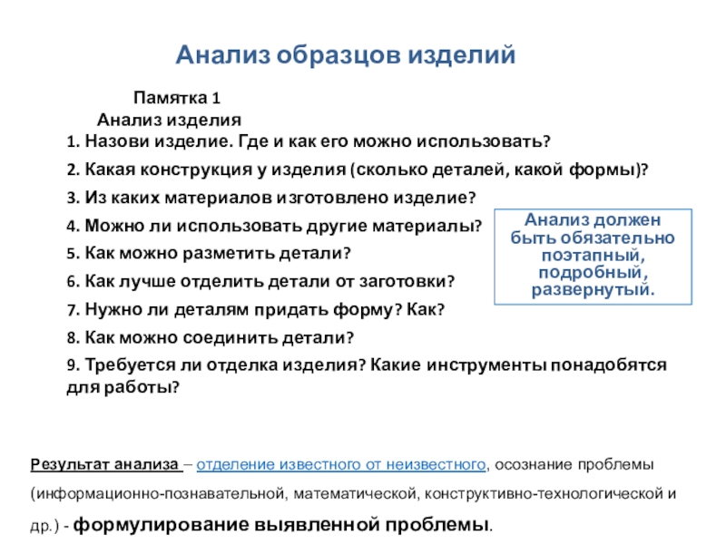 анализ как разложение на составляющие части для определения проблемы, практический поиск-упражнение, изучение рисунков, инструкционных карт, чертежей, схем…