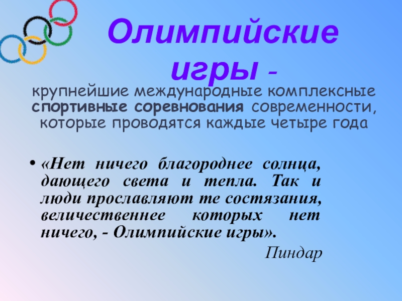 «Нет ничего благороднее солнца, дающего света и тепла. Так и люди прославляют те состязания, величественнее которых нет ничего, - Олимпийские игры».