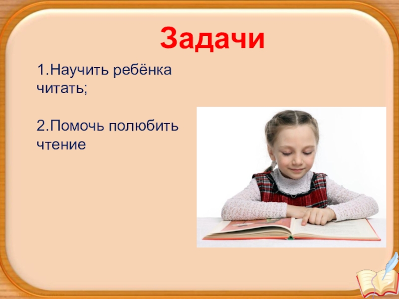 Задачи1.Научить ребёнка читать;2.Помочь полюбить чтение