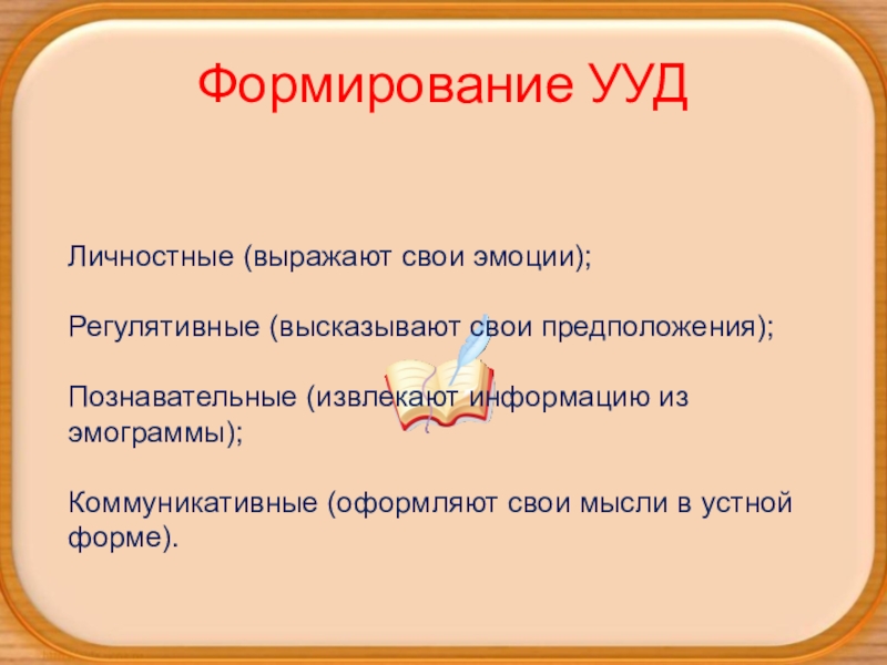 Формирование УУД Личностные (выражают свои эмоции);Регулятивные (высказывают свои предположения);Познавательные (извлекают информацию из эмограммы);Коммуникативные (оформляют свои мысли в