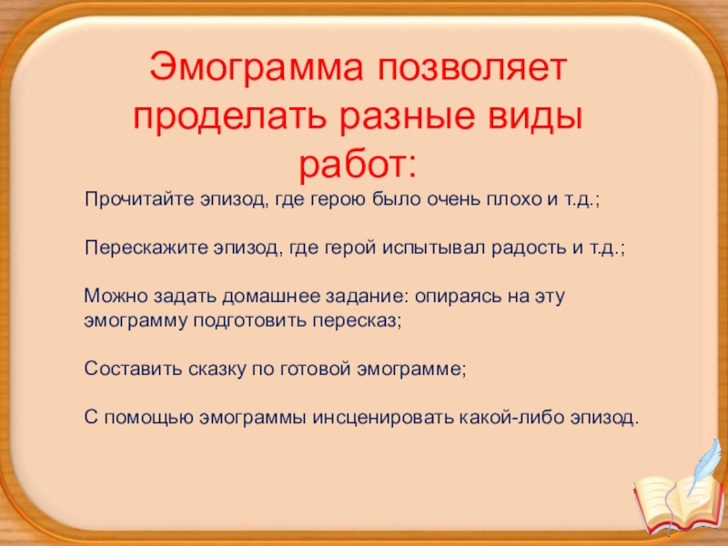 Эмограмма позволяет проделать разные виды работ:Прочитайте эпизод, где герою было очень плохо и т.д.;Перескажите эпизод, где герой