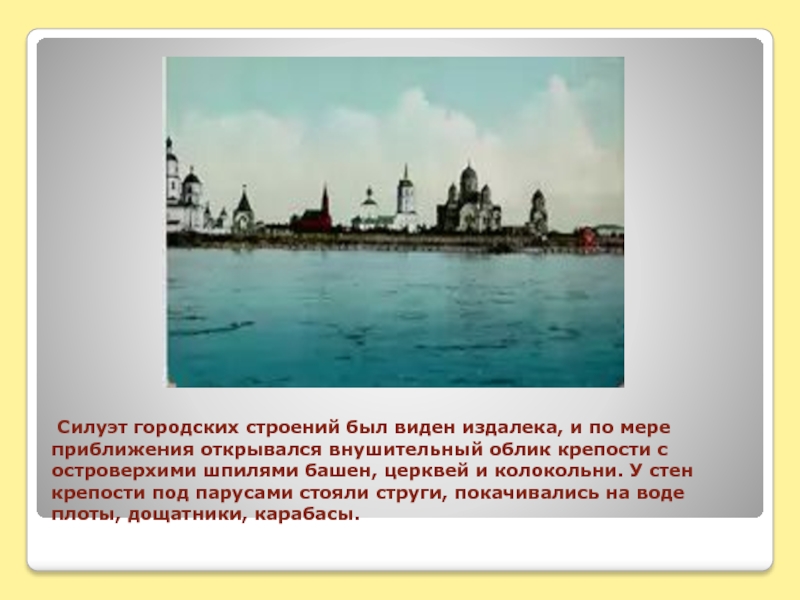 открывался внушительный облик крепости с островерхими шпилями башен, церквей и колокольни. У стен крепости под парусами стояли струги, покачивались на воде плоты, дощатники, карабасы.